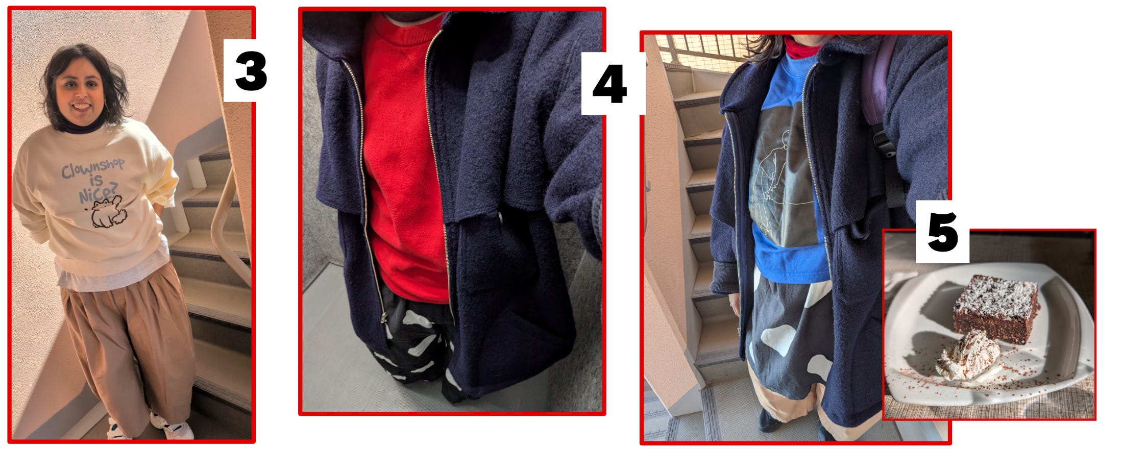 I wore the matching kurta with the tan pants and blue jumper for sewing. Afterwards, I met up with a friend, and we went to a different cafe. We had a salad set, with this rich coconut slice!