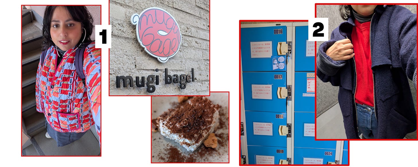 The colourful block-print jacket from Humphries and Begg, with my Nettle’s Tale skirt I got on sale. I met up with a friend afterwards, and we had a lunch set, and obviously, I got the half-size tiramisu for like an extra two dollars? Later that afternoon, I picked up some bagels on the way to a gallery. I was enchanted by the shade of these lockers!